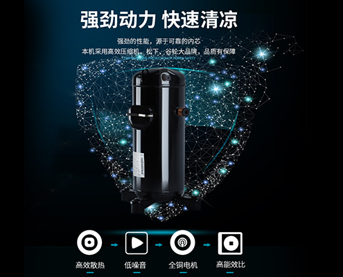 采用高效压缩机,松下、谷轮大品牌,功率足、动力强劲、铸铁外壳、密封性好,防腐防水性能稳定,使用寿命长,品质有保障。