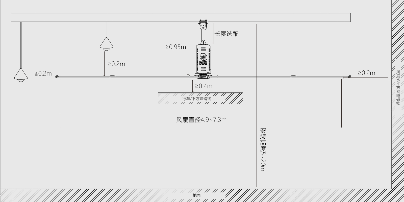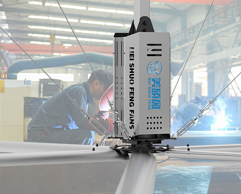 ◆每根钢丝绳拉索应力强度可达1000kg,保持风扇在旋转时产生的巨大惯性下运行平稳,当风扇发生异样时,变频器会自动报警,停止运转